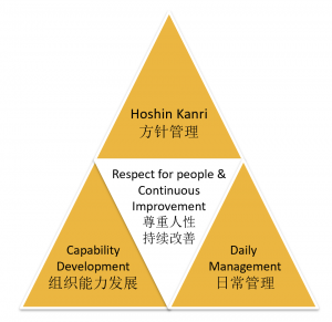 “日常管理”是确保组织“正确地做事”的基础。它关注的是现有业务流程的稳定、高效和持续改善。其核心是标准化作业和异常管理。首先建立当前最佳的工作标准,然后通过日常检查来发现与标准的偏差(即异常),并迅速解决。如果日常管理系统的建立和应用碎片化,组织架构中角色的定位不清晰,现场员工和基层管理者的培养与角色脱节,企业将无法在安全,质量,生产率,成本和人才培养方面持续取得成果。一个有效的日常管理系统可以使无数的平凡人做出卓越的业绩。它提供最有效的工作流程和指南,将每个人的输出与公司的中长远和年度目标粘合在一起。 “组织能力发展”这一块往往大多数企业都是独立操作,不系统化。传统性的观念认为只有人事部才对人员培养有责任,但这是错误的,每一个领导人都担负着人员培养的使命。“组织能力发展”强调人才培养,针对角色和技能的要求,制定组织能力发展的框架和系统,以现场作为培养员工能力提升的中心,其目的是提升员工解决问题的能力,为增强企业竞争力打下良好的能力构建基础。