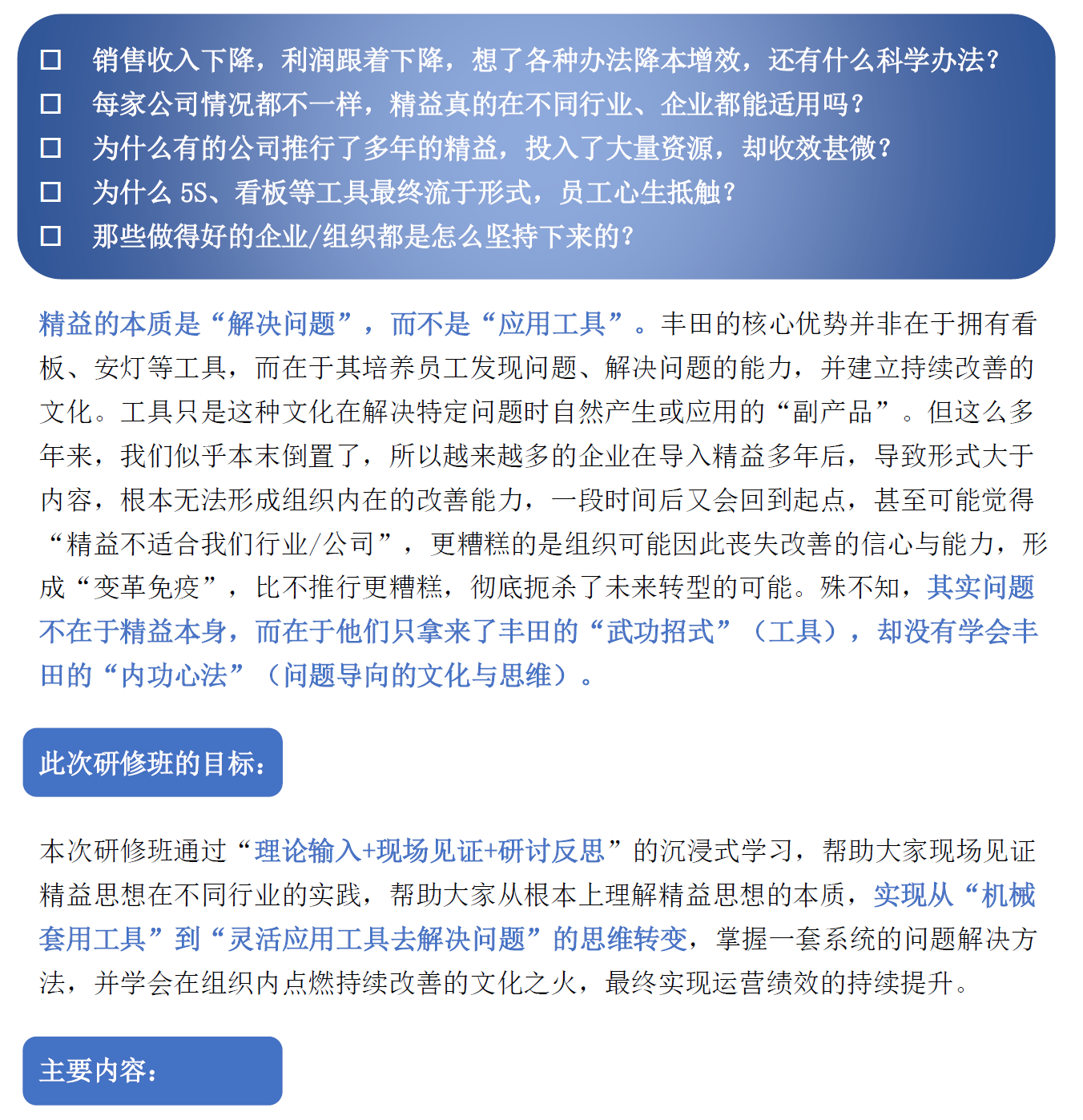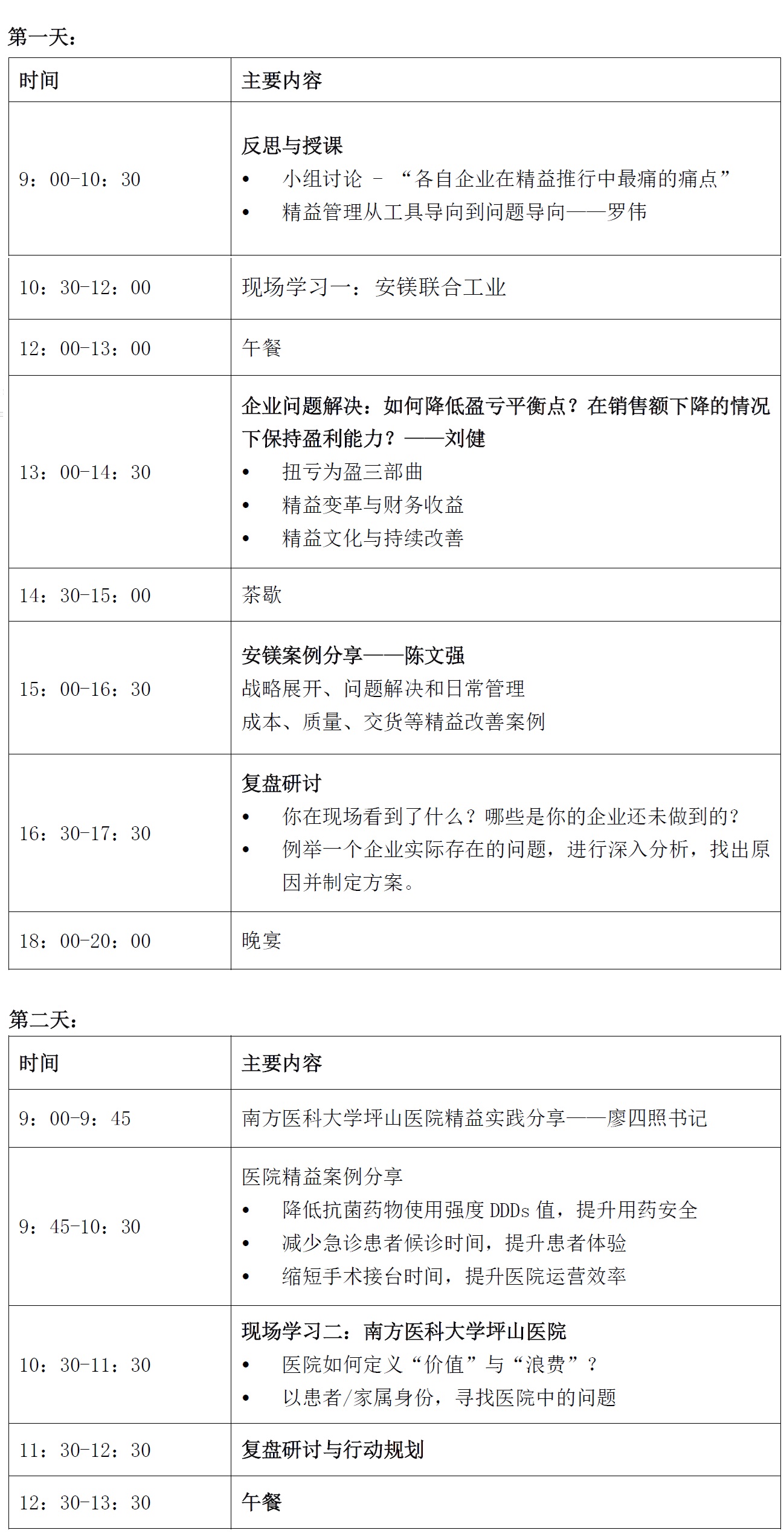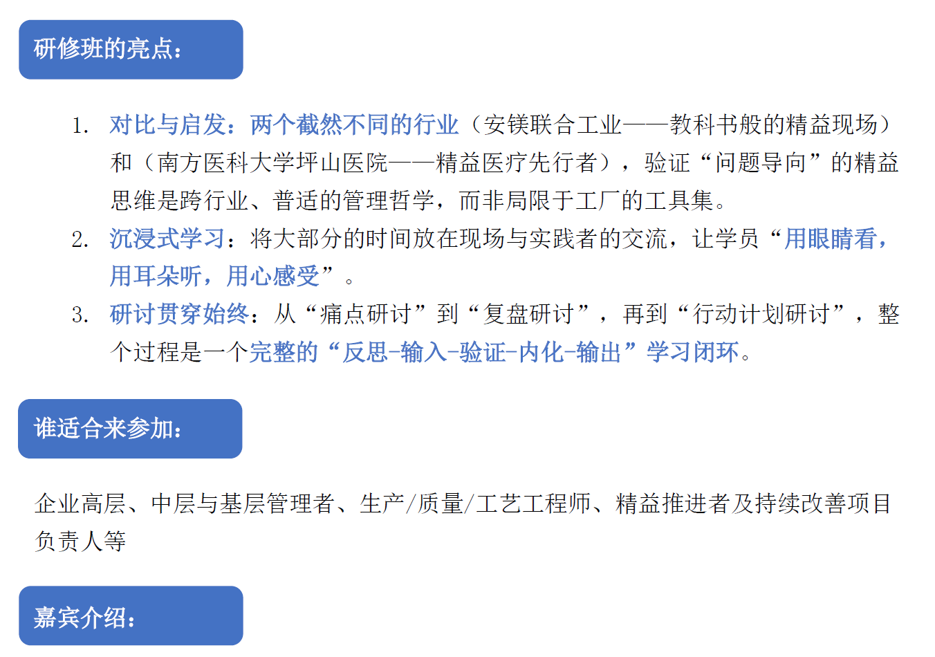 【第1期】“以问题为导向”的精益实践深度研修班(深圳) 【第1期】“以问题为导向”的精益实践深度研修班(深圳) ——走进安镁联合工业与南方医… 开始时间:2026年1月8-9日 活动地址:深圳 报名截止:2025年12月31日 【第1期】“以问题为导向”的精益实践深度研修班(深圳) ——走进安镁联合工业与南方医科大学坪山医院 2026年1月8-9日 0 登录后报名 分享至: