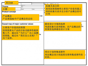 5)项目A3:主题→产品概念→主要客户价值的因果图→权衡关系分析→最佳设计方案的选择→项目计划和集成事件。